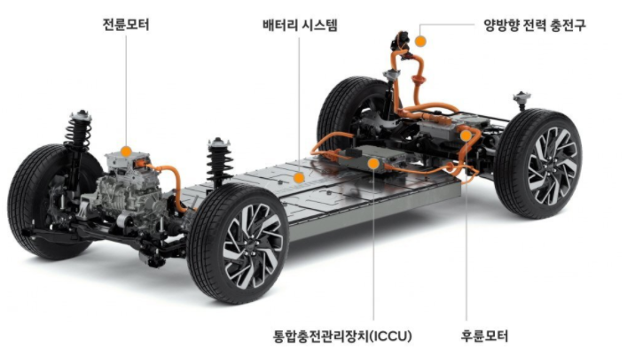 아이오닉의 경우 전륜과 후륜에 모터가 각각 탑재된 듀얼 모터 시스템을 보여줍니다. 최고 출력은 313마력(230kw)을 보여주고 있고요. 제로백의 경우 5.1초가 소요된다고 합니다.