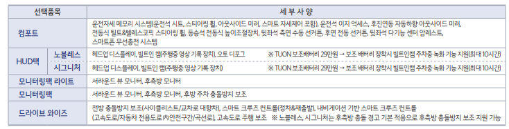 •편의 : 버튼시동 스마트키 시스템(원격시동 기능 포함), 스마트 트렁크, 하이패스 자동결제 시스템,