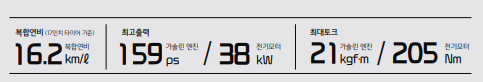 •하이브리드 시스템 : 38kW 구동 모터, 회생제동 브레이크 시스템, 리튬이온 폴리머 배터리 시스템
