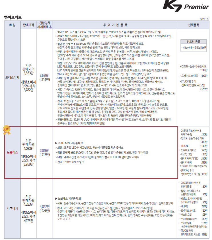 K7 하이브리드의 트림은 총 3가지 모델로 판매 중입니다.