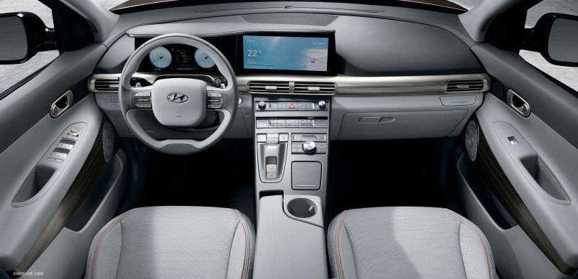 연료전지 시스템(113kW 구동 모터, 리튬 이온 폴리머 배터리, 감속기, 회생제동 시스템), 전자식 변속 버튼, 통합주행모드
