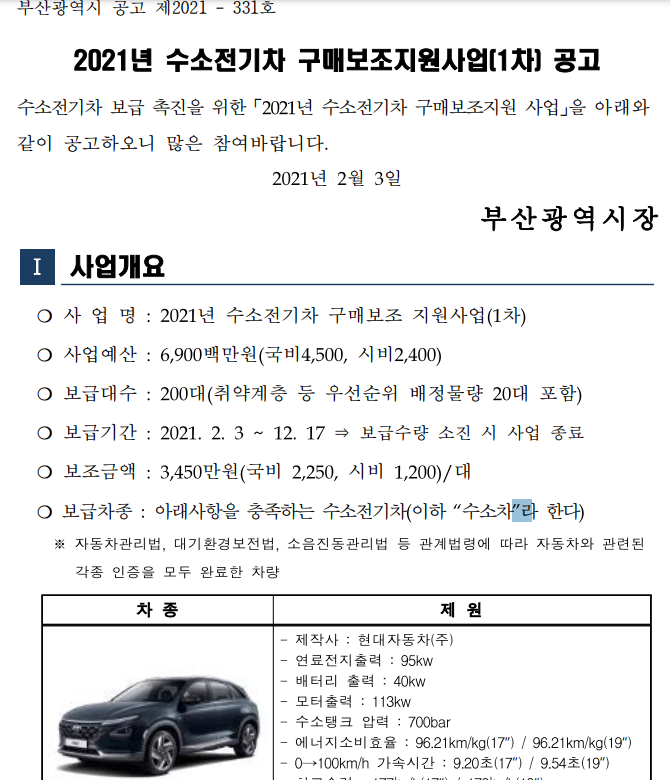 2021년 수소 전기차 부산광역시 구매보조지원사업 1차 공고