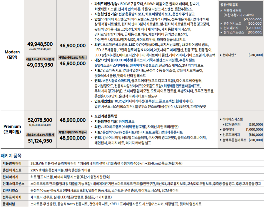 코나 전기차는 모던과 프리미엄 2가지 트림이 존재합니다.