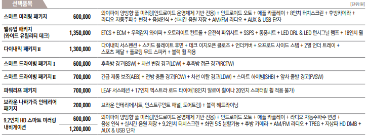 크루즈 컨트롤 시스템, 와이퍼 결빙 방지장치, 매뉴얼 에어컨, 2열 에어벤트, USB 충전기(소켓 타입),