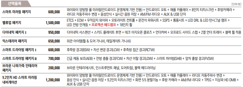 •안전 사양 : 운전석 & 동승석 에어백, ESP(가변형 HDC, BAS, ARP, HSA, ESS), 타이어 리페어 킷,