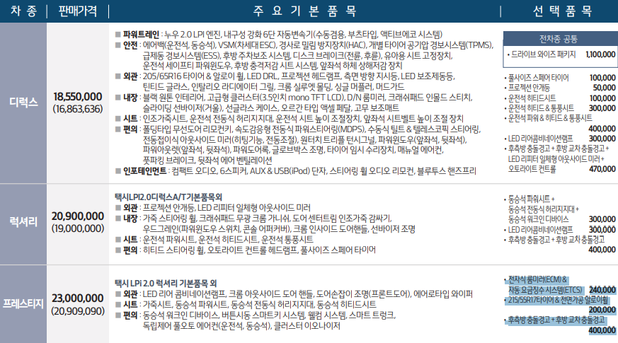 택시 LPi 2.0 럭셔리 기본품목을 포함