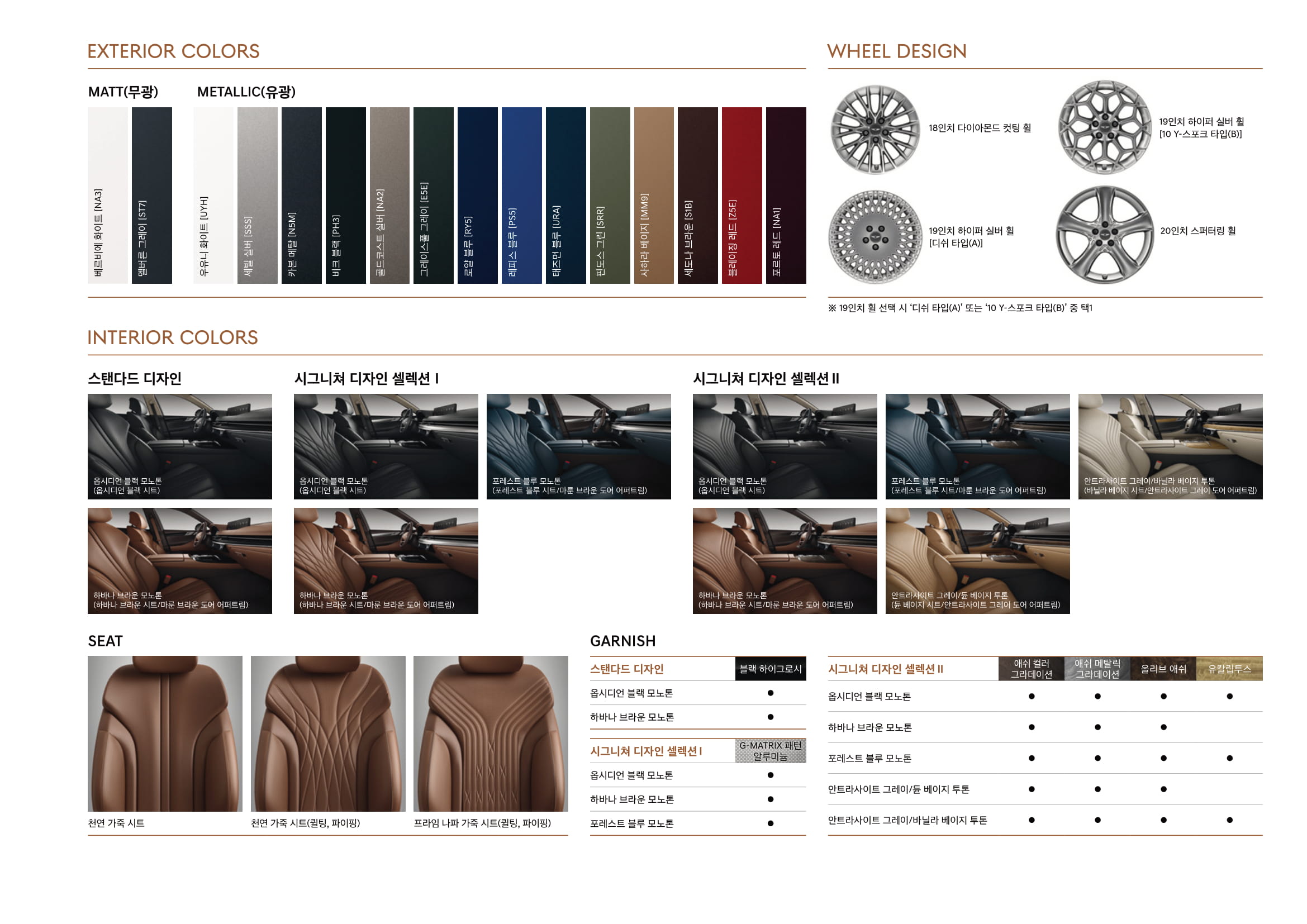시그니쳐 디자인 셀렉션Ⅱ - 프라임 나파 가죽 시트(퀼팅, 파이핑 적용), 프라임 나파 가죽 내장재 (센터콘솔 암레스트, 스티어링 휠 혼 커버), 오픈포어 리얼우드 내장재, 럭셔리 스웨이드 내장재(헤드라이닝, 필라 트림 등), 인조가죽 내장재 (크래쉬패드, 도어 센터트림), 인조실크 카매트 [2,950,000]