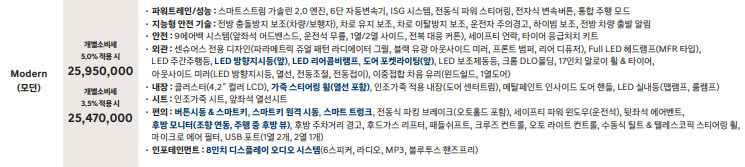 가솔린 2.0 엔진, 전동식 파워 스티어링, 통합 주행모드, 전방 충돌 방지 보조, 차로 유지 이탈 방지 보조, 하이빔 보조, 천방 차량 출발 알림, led 주간 주행 등, led 방향지시등, full led 헤드램프, 스마트키, 스마트키 원격 시동, 열선 핸들, 후방 모니터, 오토라이트 컨트롤, 8인치 디스플레이 오디오