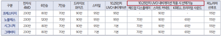 | ▶ 프레스티지 기본품목포함 •내장 : 슈퍼비전 클러스터(12.3인치 풀사이즈 칼라 TFT LCD/10.25인치 UVO 내비게이션 선택시 테마형 클러스터 기능 지원), 인서트 필름 내장재, 도어 센터트림 나파엠보 감싸기 •시트 : 가죽시트 •편의 : 서라운드 뷰 모니터, 후측방 모니터, 운전자세 메모리 시스템(운전석 시트, 아웃사이드 미러), 2열 측면 수동 선커튼, 1열 시트백 USB 단자(충전용), 220V 인버터 |