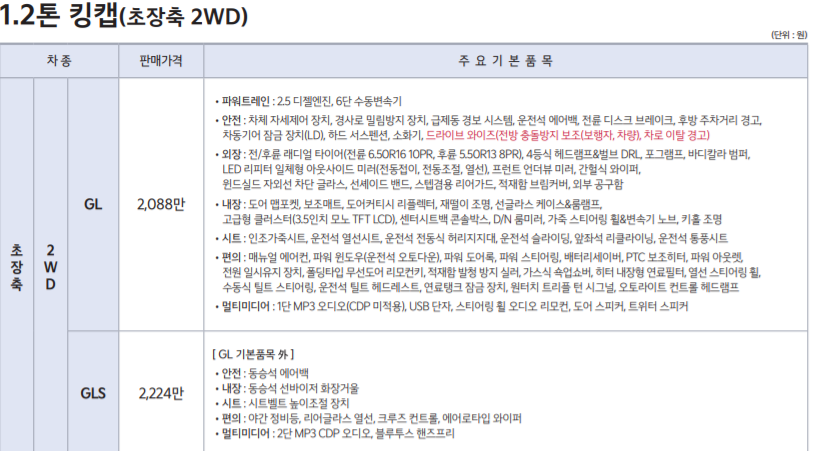 | [ GL 기본품목 ] •안전 : 동승석 에어백 •외장 : 범퍼가드 •시트 : 운전석 통풍시트 •편의 : 야간 정비등, 리어글라스 열선, 에어로타입 와이퍼 •멀티미디어 : 2단 MP3 CDP 오디오, 트위터 스피커 |