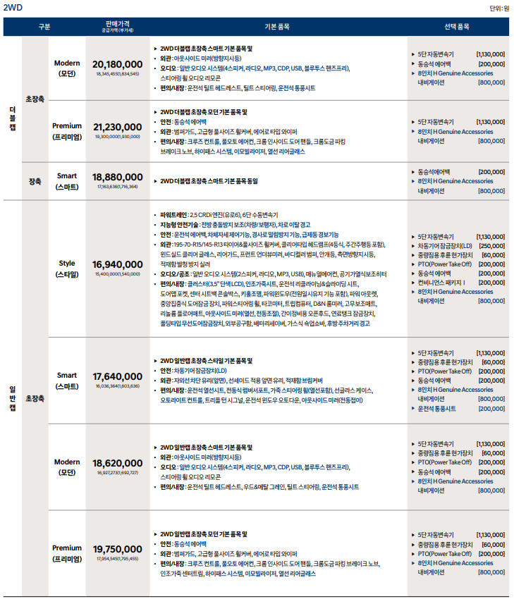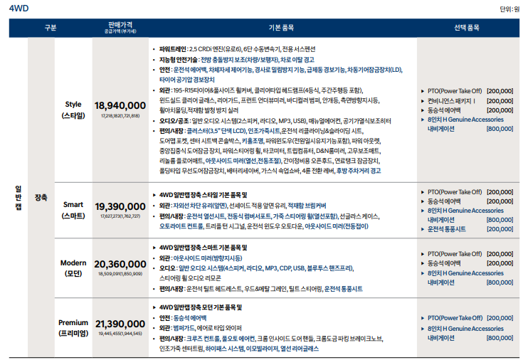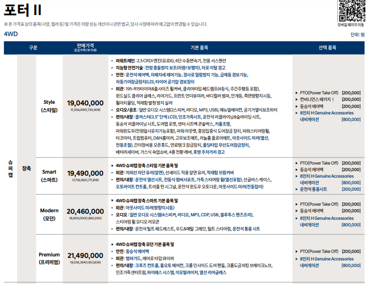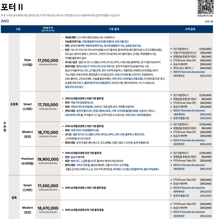 하단 가격표에는 포터 2 4wd 가격도 나와있습니다.