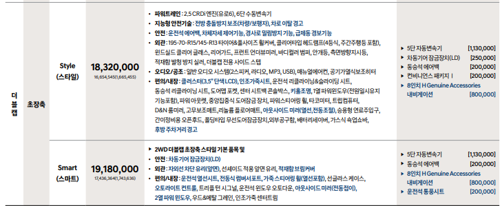 - 외관 : 바디컬러 범퍼, 안개등, 사이드 미러 방향지시등, 더블캡 전용 발판