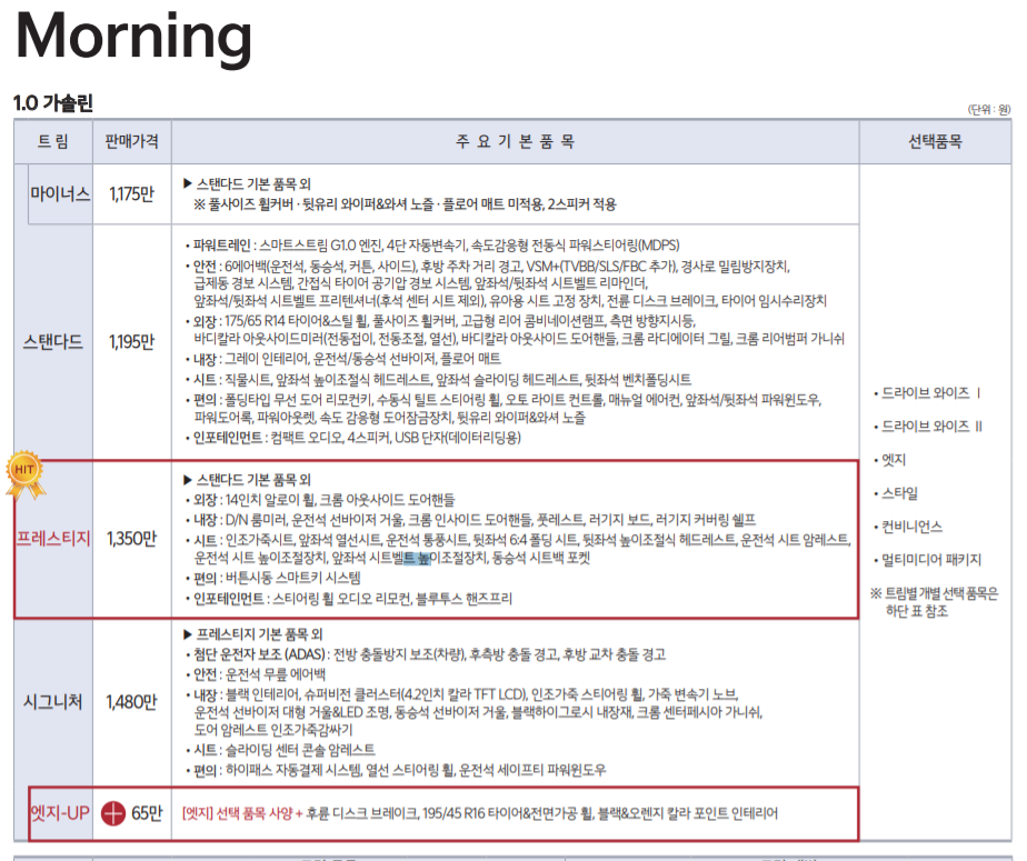 모닝은 크게 스탠더드, 프레스티지, 시그니처로 3가지 트림이 존재합니다.