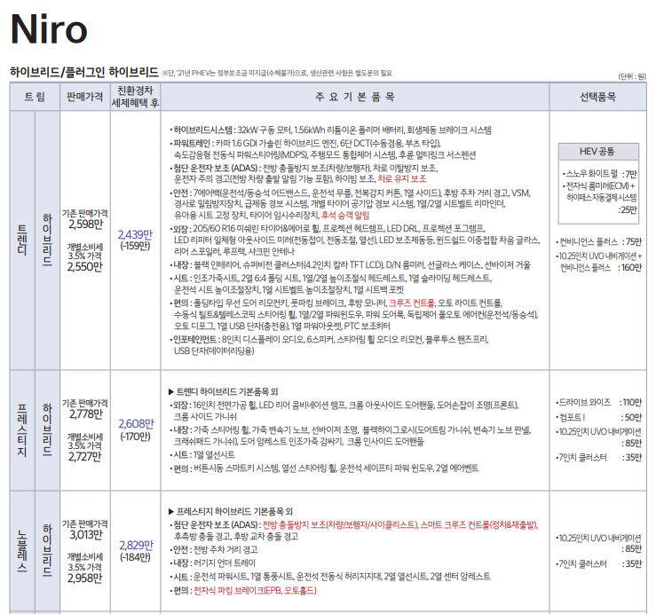 니로 프레스티지 기본 품목 포함