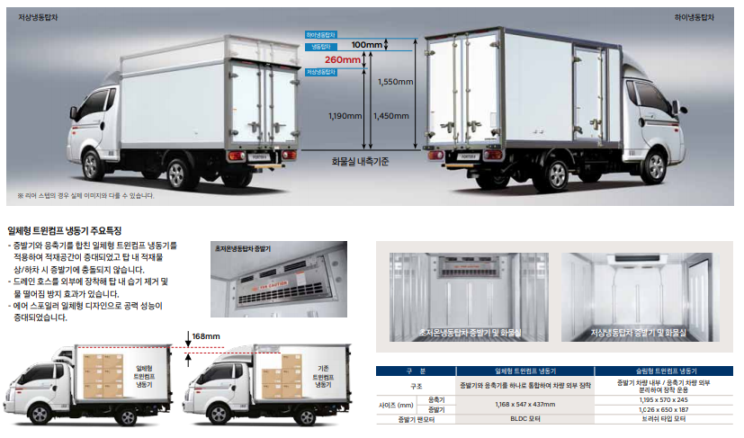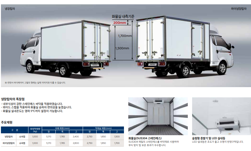 특히, 화물 적제 칸 실내 온도는 영하 5도까지 설정 가능하여 냉장 식품 수송에 적합한 모습을 보입니다.