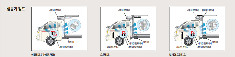 냉동기 펌프가 존재하여 냉동 온도를 조절하며 냉동 식품 수송이 가능합니다.