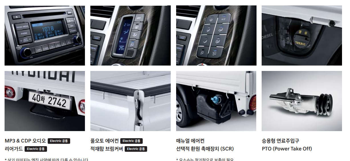 • 외관 : 자외선 차단 유리(앞면), 선셰이드 적용 앞면 유리, 적재함 브림 커버