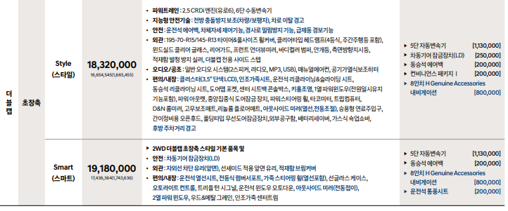 ▶ 2WD 더블캡 초장축 스마트 기본 품목 및