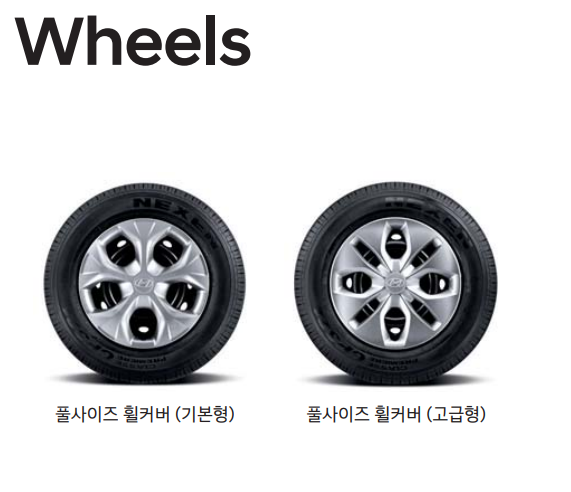 • 외관 : 195-70-R15/145-R13 타이어&풀사이즈 휠 커버, 클리어 타입 헤드램프(4등식, 주간 주행 등 포함),