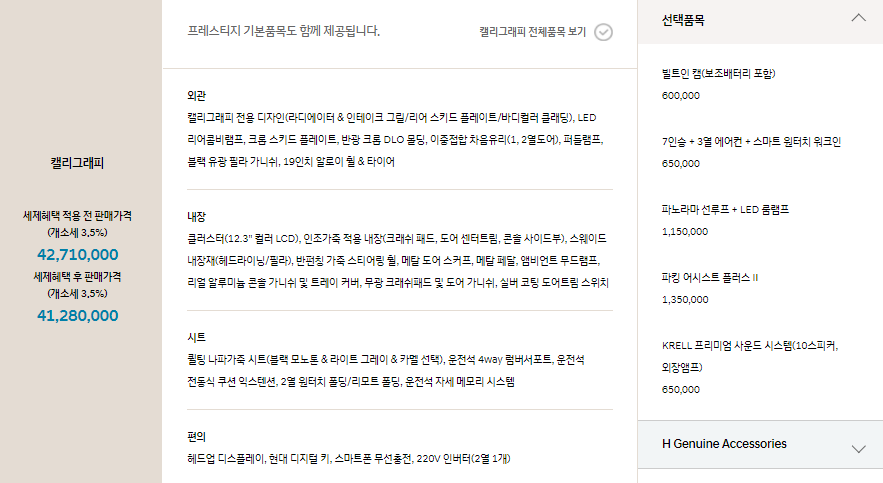 싼타페 하이브리드는 익스클루시브, 프레스티지, 캘리그래피 트림으로 나누어져 판매합니다.