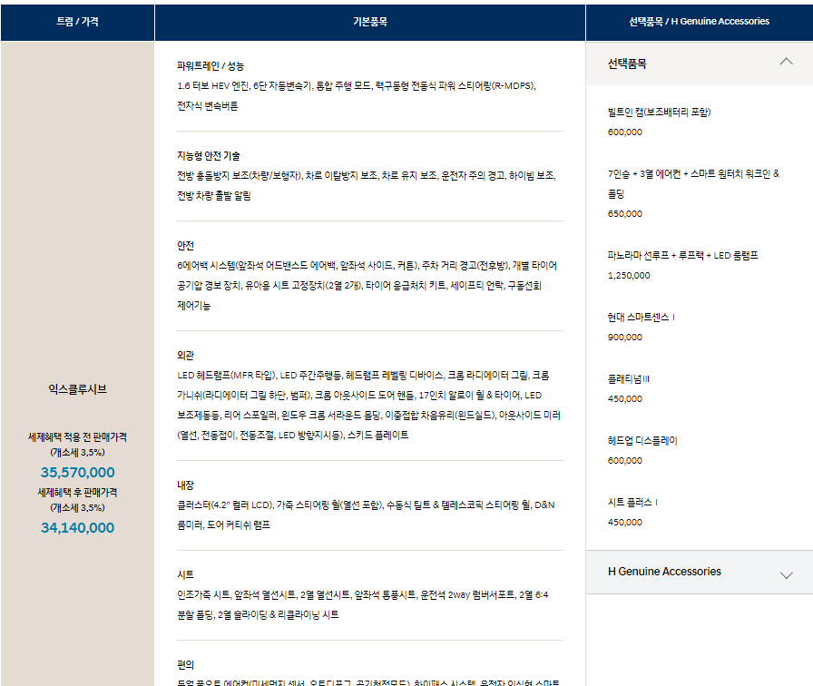 프레스티지, 노블레스, 시그니처의 트림으로 3500만원 ~ 4천만 원 초반으로 가격이 포진하고 있습니다.
