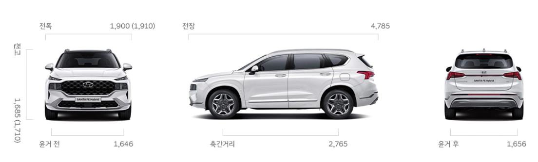 싼타페 하이브리드와 쏘렌토 하이브리드 제원을 단순 수치고 비교해보면 쏘렌토 하이브리드가 다소 큰 것을 알 수 있습니다.