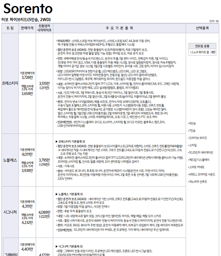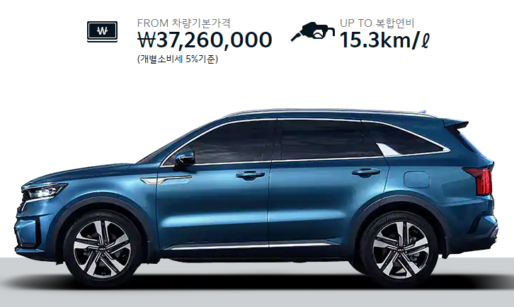 쏘렌토 하이브리드 가격은 친환경차 세금 감면 혜택을 기준으로 3500만 원부터 시작합니다.