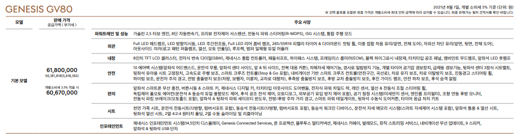 현재 gv80 가격은 기본 모델 61,800,000원부터 6천만 원대부터 시작합니다.