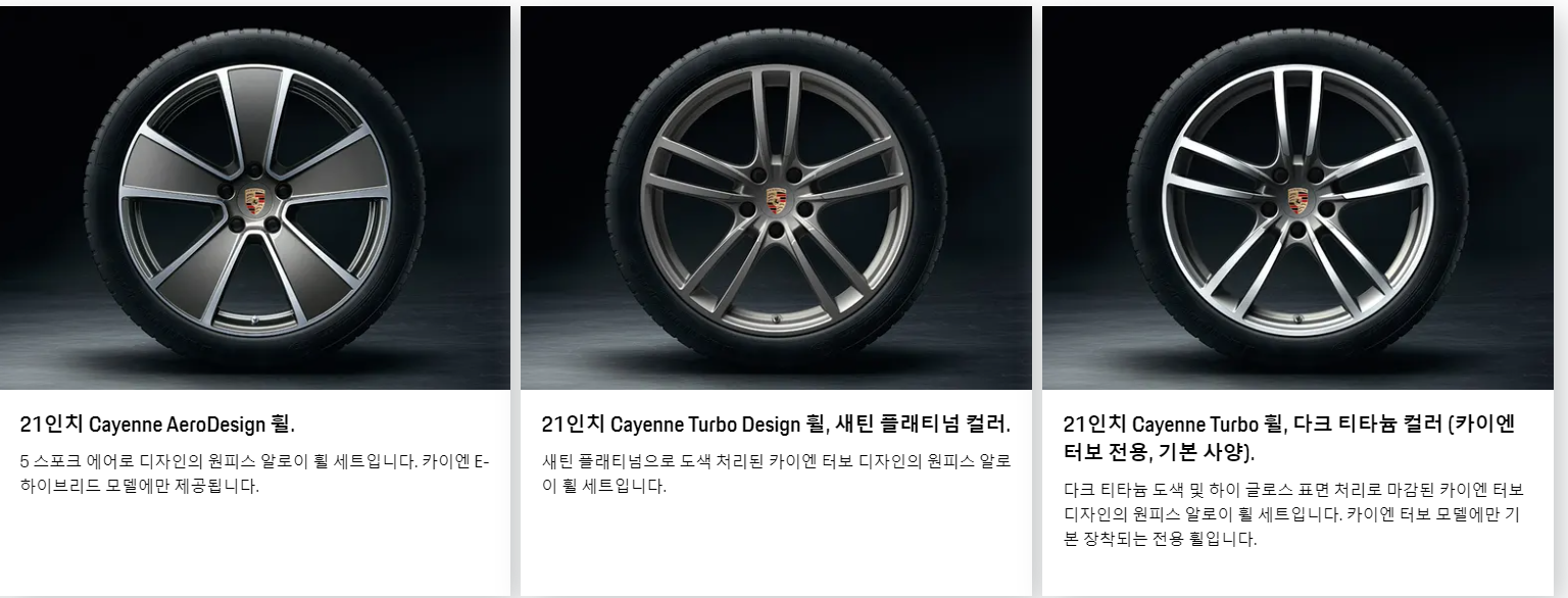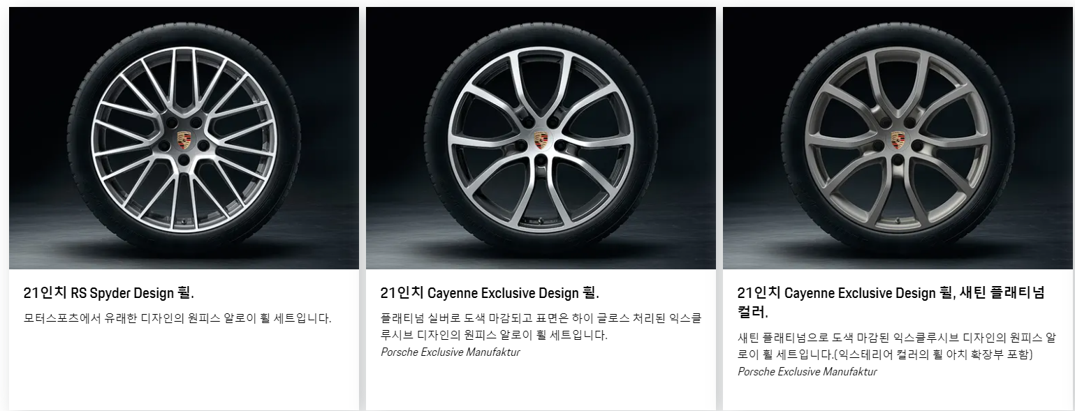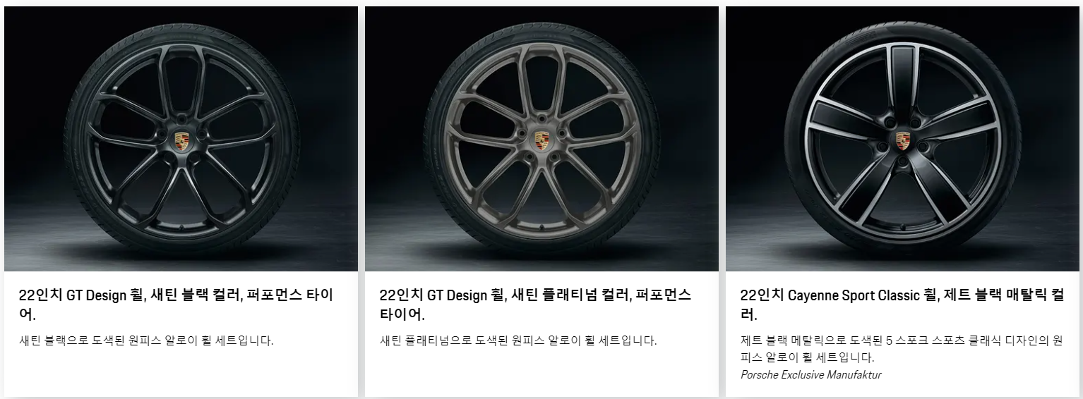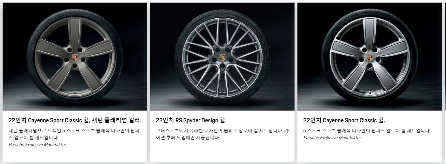 포르쉐 휠은 다양한 모습으로 옵션 구성별로 선택이 가능합니다. 디자인에따라 각각의 추가요금이 다르니 잘 비교하셔서 선택을 하셔야 할듯 합니다. 일반 차량에 비하여 선택지가 많아서 이점은 만족할만한 모습입니다.