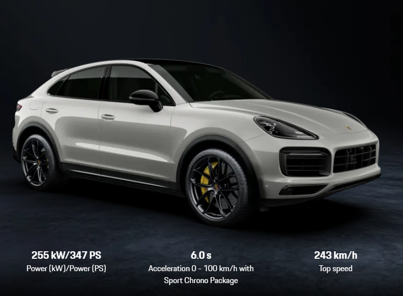 카이엔 쿠페 모델은 347마력으로 6초의 제로백을 보여주고 있습니다.