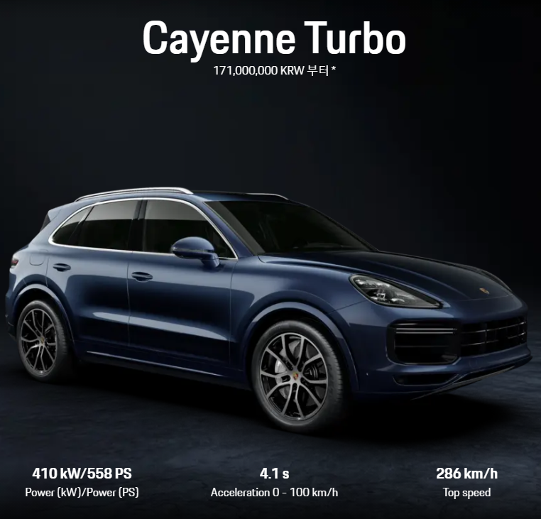 카이엔 터보 모델입니다. 카이엔 터보 모델은 558마력으로 4.1초의 제로백을 보여주는데요, 엄청난 힘을 자랑하는 포르쉐 카이엔 터보입니다.