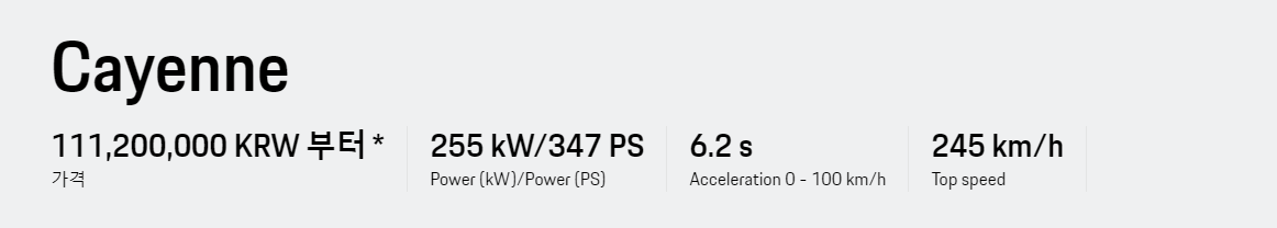 카이엔 일반 suv 모델입니다. 347마력으로 제로백의 경우 6.2초입니다.
