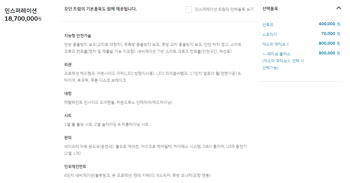 최상위 트림인 캐스퍼 인스퍼레이션은 1,870만 원에 가격이 책정되어 있습니다.