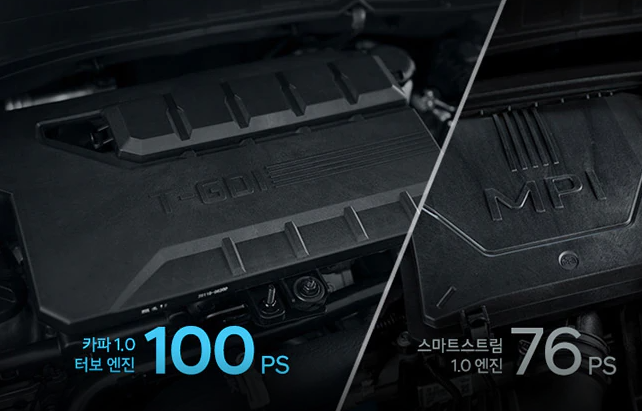현대자동차 경차 캐스퍼는 1.0 가솔린 엔진과 1.0 가솔린 터보 엔진 두 가지로 나누어져 있습니다.