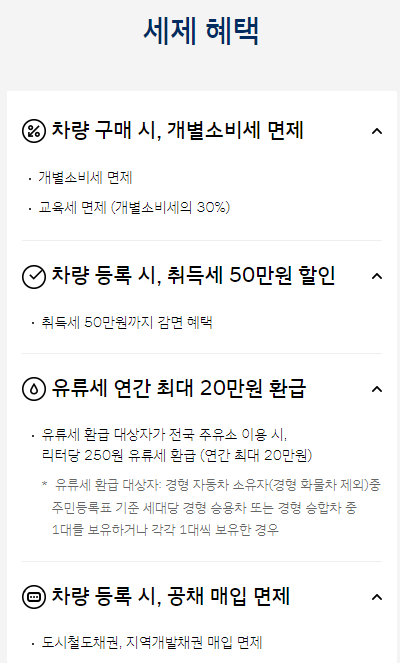 - 차량 등록 시, 취득세 50만 원 할인이 제공됩니다.