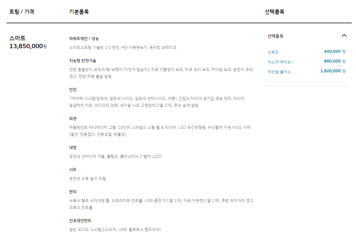 캐스퍼 스마트 트림은 1,385만 원으로 경차임에도 저렴하지 않은 기본 트림 가격을 보여주고 있습니다.