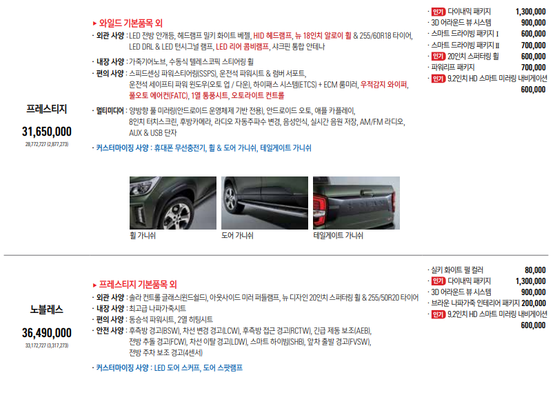 와일드, 프레스티지, 노블레스로 총 3가지 트림으로 판매 중입니다.