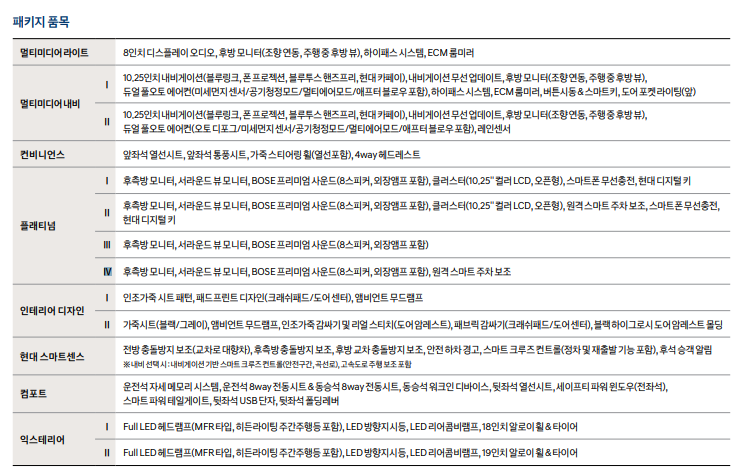 후측방 모니터, 서라운드 뷰 모니터, BOSE 프리미엄 사운드(8 스피커, 외장 앰프 포함), 클러스터(10.25'' 컬러 LCD, 오픈형), 원격 스마트 주차 보조, 스마트폰 무선충전,