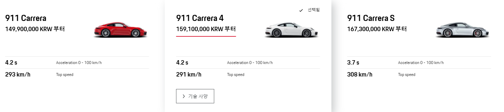 911 카레라는 제로백 4초대 기본 모델을 시작으로 최대 3초대의 카레라 gts까지 출력별 모델, 가격이 다릅니다.