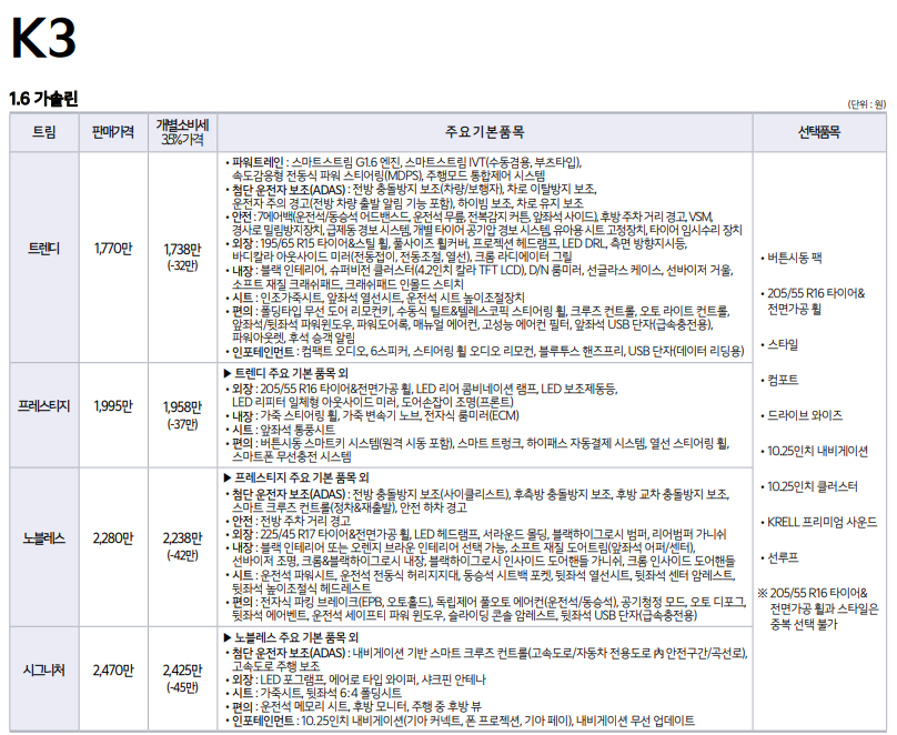 k3 가격은 1천만 원 후반부터 2천만 원 초반으로 책정되었습니다.
