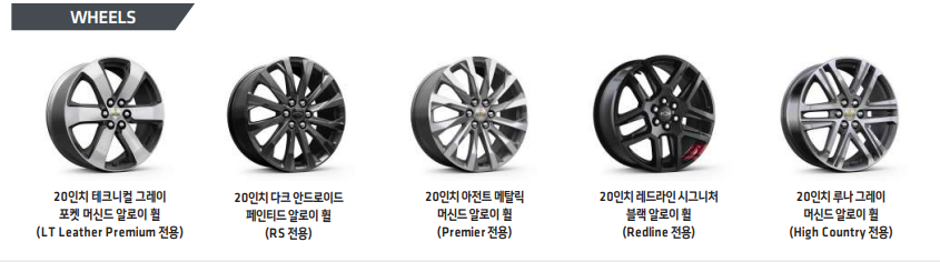 디자인에 따라 lt, RS, Premier, high country, redline 트림으로 나누어 판매됩니다.