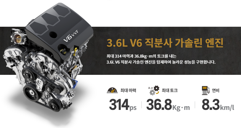 직분사 가솔린 엔진으로 최대마력 314ps로 충분한 주행성능을 보여줍니다.