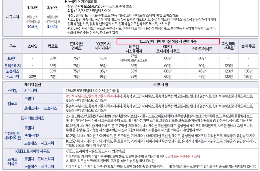 k5 하이브리드는 트렌디, 프레스티지, 노블레스, 시그니처 트림으로 나누어 판매 중입니다.