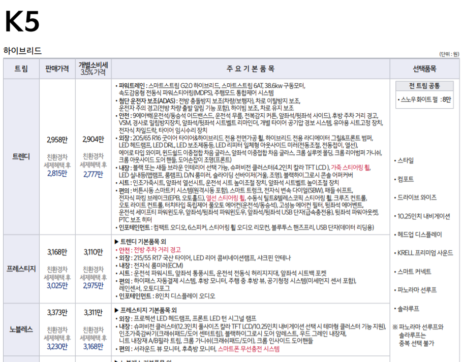 k5 하이브리드 트렌디 기본품목 포함 이외
