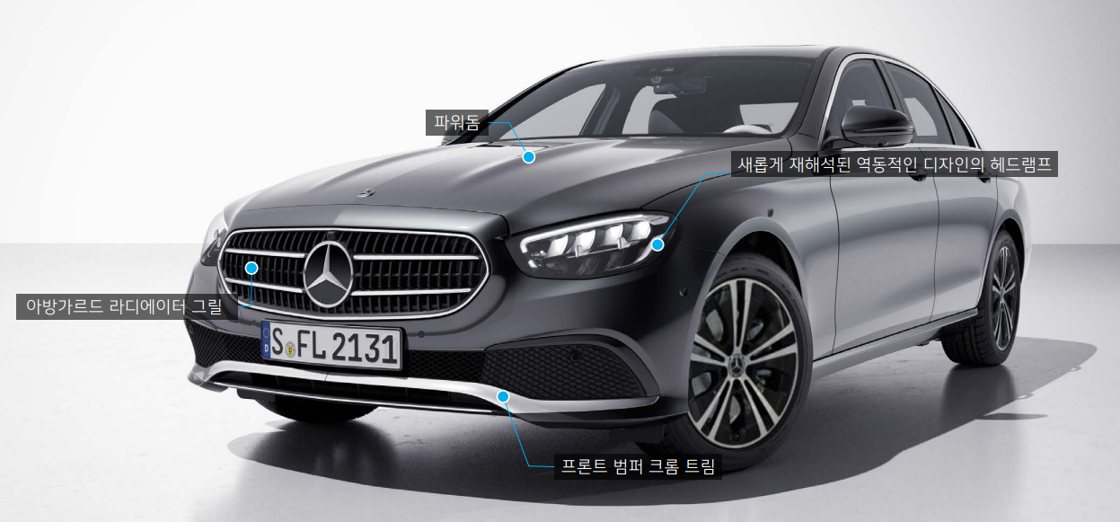 벤츠 e클래스 익스클루시브 디자인은 중후한 모습이 특징입니다.