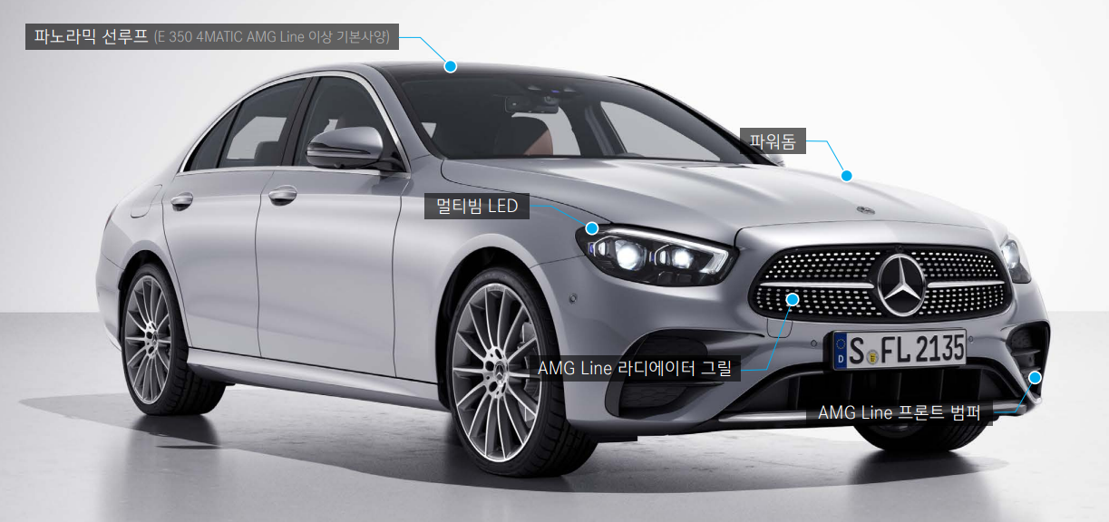 e클래스 상위 모델인 amg line 디자인은 고성능 버전의 디자인을 적용하였습니다.
