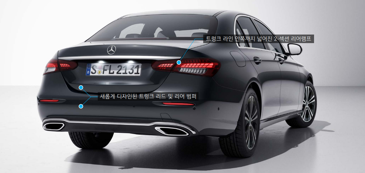 새롭게 변경된 e클래스 후면 디자인도 기존보다 좌우로 길게 뻗으며 날렵한 모습을 보여줍니다.