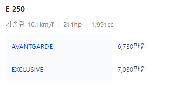 e클래스 가솔린 기본 모델은 e250입니다.