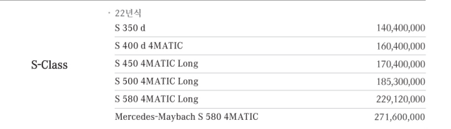2022년형 s클래스 공식 가격은 다음과 같습니다.