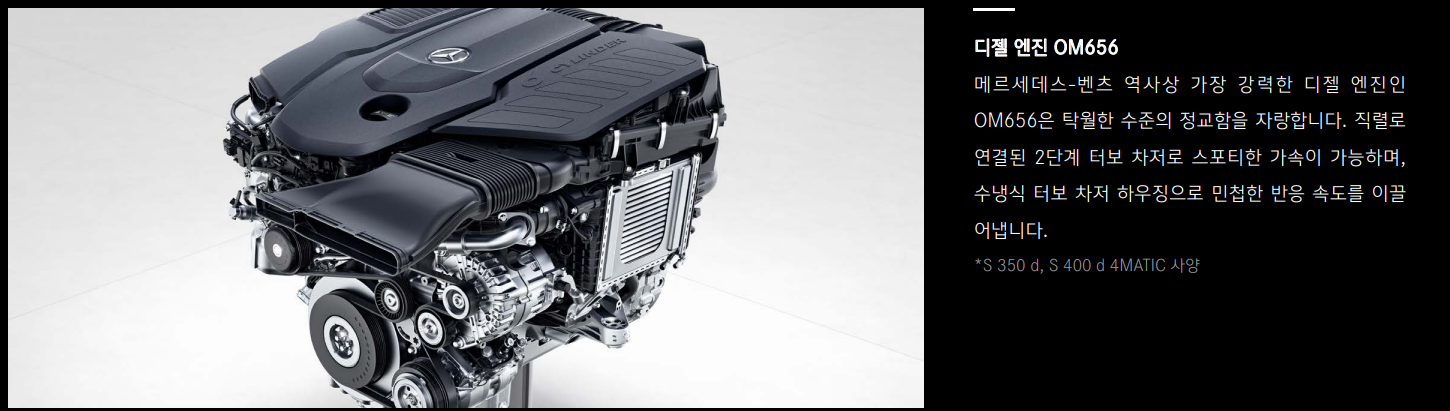 s클래스 디젤 엔진은 직렬로 연결된 터보 차저가 스포티한 가속을 도와주어 민첩한 반응속도를 이끌어 냅니다. 또한 디젤임에도 엔진 소음 실내 유입을 차단시켜, 정숙한 실내 환경을 제공합니다.